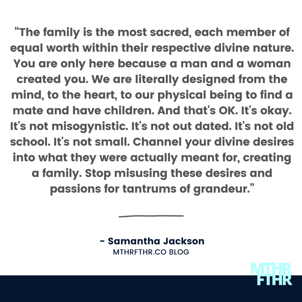 The family is the most sacred, each member of equal worth within their respective divine nature. You are only here because a man and a woman created you. We are literally designed from the mind, to the heart, to our physical being to find a mate and have children. And that’s OK. It’s okay. It’s not misogynistic. It’s not out dated. It’s not old school. It’s not small. Channel your divine desires into what they were actually meant for, creating a family. Stop misusing these desires and passions for tantrums of grandeur.